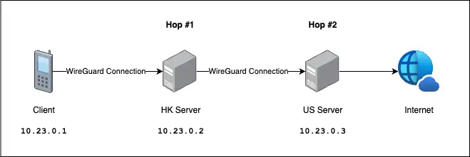 ...As we can see, our traffic is sent from the client, to the HK Server (10.23.0.2) and then US Server (10.23.0.3) then to the internet. Mission accomplished!